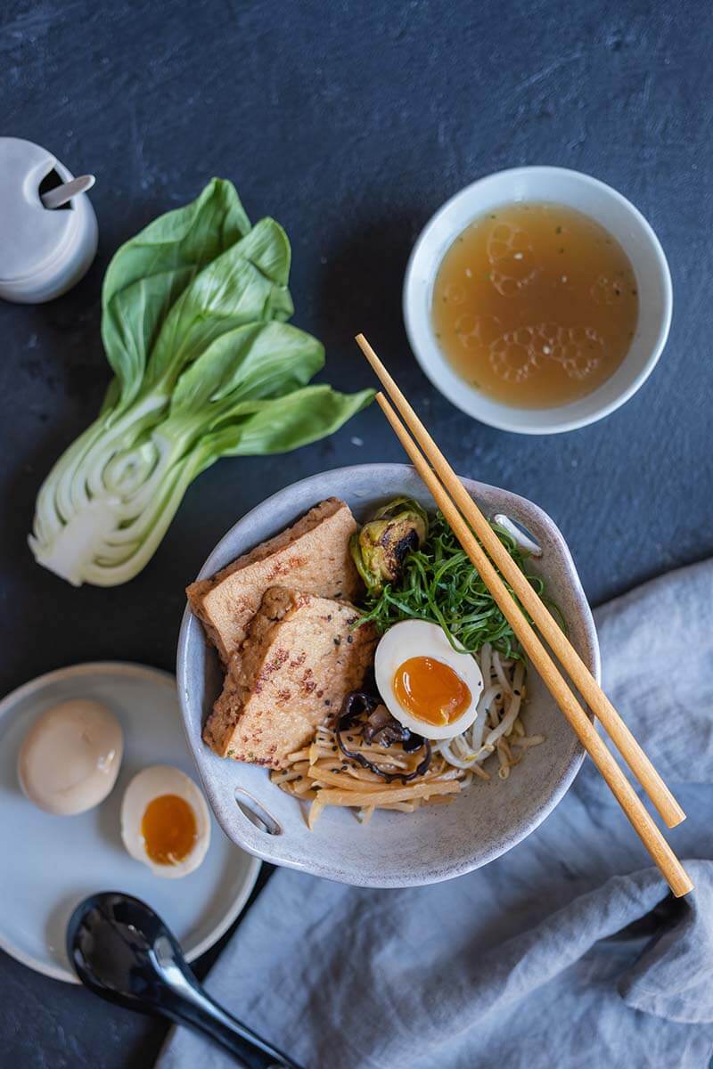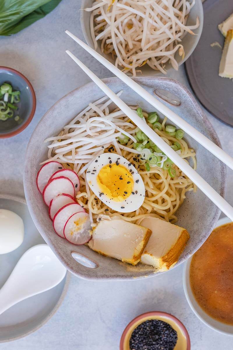 Noodles, tender pork belly, boiled egg, corn, scallions, seaweeds.